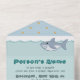 Esta invitación todo en uno con temática de la hora del baño y tarjeta extraíble RSVP cuenta con un patrón de baldosas adornadas con estrellas de mar que se parece a una pared de baño con un borde de bañera blanca y la parte superior de agua rizada que se transforma en un fondo de arena de la manera en que la imaginación de un niño puede convertir lo mundano y cotidiano en una aventura extraordinaria. En la parte superior de esta escena hay un tiburón gris sonriente; un submarino redondo y juguetón con colores primarios; un texto de muestra tipo ondulante en el interior que se puede personalizar para el evento; y un espacio en blanco en el exterior que se puede usar para dirigir las tarjetas al destinatario y la sección que se puede devolver con la dirección de retorno apropiada. No olvide visitar la colección completa de Bath Time Fancy para más regalos y productos de primera necesidad para una ducha o la pequeña de tu vida.