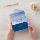 Reunión en la playa, invitaciones a reuniones familiares con tarjetas de respuesta desmontables. Imprima el texto de la invitación en la parte central de la tarjeta doblada. La tarjeta de respuesta se desgarrará para que el destinatario le devuelva el correo. Se toma el franqueo de postal. Un océano tranquilo y una imagen de arena son el fondo de un texto negro impreso con un tipo de letra moderno. El exterior es azul oscuro con plantillas de texto en blanco para incluir tres direcciones. Quite el texto de la dirección de correo y devolución si utiliza un sobre externo.