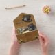Esculturas de Steampunk doradas y de latón sobre gamuza con un marco de textura de cuero y diseño de esculturas y sombreros steampunk para la pareja de novios.
