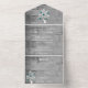 Invite a sus huéspedes a su próximo boda con un Verde azulado árbol de corazones todos en una invitación de boda. El diseño de la invitación tiene un fondo de madera gris adornado con un árbol con corazones floridos en sus ramas con una tarjeta RSVP perforada. Personaliza con los nombres del novio y la novia junto con la fecha y el lugar del boda. También hay material de boda adicional disponible con este diseño.
