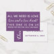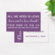 "Todo lo que necesitamos es amor. ¡Amor y bebida gratis! Esta está sobre nosotros. Canje por una bebida adulta gratis". Cada una de las cuatro líneas de texto se agregaron por separado y se pueden editar por completo, ya sea que desee cambiar la redacción, el tamaño, el tipo de letra, el color o la posición. Todas las palabras en la parte delantera son blancas sobre un fondo morado editable. // En la parte de atrás, se utilizó el "tipo elegante" para representar la palabra "¡Saludos!" que se rotó y colocó sobre la banda morada a lo largo del lado izquierdo. El otro tipo se manejó en sentido inverso: sus nombres y fechas aparecerán en el texto púrpura sobre un fondo blanco. Puede cambiar cualquiera de los colores si desea una paleta diferente. // Por favor, no dude en contactar con cualquier solicitud especial o si necesita ayuda para personalizar la ayuda. // 9 // Diseñado por Melody Watson para la Muserie de papel.