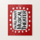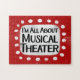 "I'm All About Musical Theater" es un lindo diseño de texto en rojo con texto negro, junto con una forma de acento blanco y puntos caprichosos de textura blanca que lo rodean.