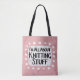"I'm All About Knitting Stuff" es un lindo diseño de texto en rosa con texto en negro y rojo, junto con una forma de acento blanco y puntos caprichosos de textura blanca que lo rodean.