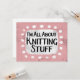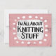 "I'm All About Knitting Stuff" es un lindo diseño de texto en rosa con texto en negro y rojo, junto con una forma de acento blanco y puntos caprichosos de textura blanca que lo rodean.