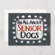 "I'm All About Senior Dogs" es un diseño de texto bonito en gris con texto en negro y rojo, junto con una forma de acento blanco y puntos caprichosos de textura blanca que lo rodean.