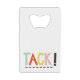 ¿No puedes encontrar un abrebotellas justo cuando estás a punto de abrir esa botella especial? ¿Por qué no lo tienes en tu bolso o en tu cartera y siempre estás preparado para un fiesta? ¡Este práctico pero hermoso abridor de botellas de tarjeta de crédito es de nuestro TACK! Colección de colores y muestra la palabra TACK (o Gracias, en sueco) en nuestra alegre y colorida fuente sans serif. ¿Cómo este diseño? No te olvides de comprobar la gran variedad de productos a juego.