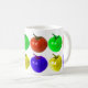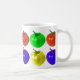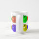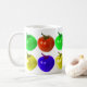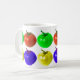 Una taza con diversos tomates coloreados en ella. Usted bebe de ella.