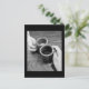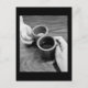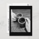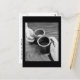 Esta postal contiene una foto en blanco y negro de tazas de café con una redacción en la parte de atrás, una buena manera de enviar una nota rápida para tomar una taza con un amigo.
