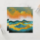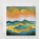 Escena paisajística abstracta de una vista montañosa con colinas ondulantes y una tormenta en naranja, oro, azul y cian.