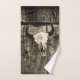 Tapón de búfalo de color beige oscuro retro antiguo occidente con cuernos sobre una toalla de baño de madera de granero colocada para el vaquero en su interior. Esta impresionante decoración antigua sepia de color marrón bisonte huesos de arte fotografía casa es para cualquiera que disfrute del salvaje país oeste rodeado de tierras de labranza o le encantan las cosas rústicas. Molesto, texturizado, fresco, moderno, moderno, moderno, ideas de regalo. Busca productos coincidentes en mi colección de tiendas. Derechos de imagen de Marg Seregelyi Photography.