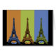 ¡Bonjour! El diseño de la Torre Eiffel en París Triptych se compone de tres paneles verticales de un color diferente cada uno, azul cielo profundo, naranja quemado y tonos verdes brillantes. Las tres torres Eiffel negras se exhiben en los colores contrastantes de los paneles de fondo. Celebre la Ciudad de las Luces y la Torre Eiffel con el diseño de arte pop de la Torre Eiffel en París Triptych.