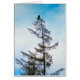 Fotografía de un águila calva norteamericana encaramada sobre un alto pino. Un cielo azul con nubes nubladas están en el fondo. Se pueden encontrar rastros de luz solar y nieve en el árbol y sus ramas. Derechos de autor 2017 Kimberly J Tilley.