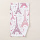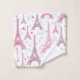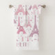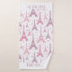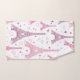 Las torres Eiffel ilustradas en rosa y púrpura con corazones dibujados a mano en un patrón repetido.  Personaliza tu nombre o mensaje en una fuente morada.