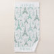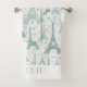 Las torres Eiffel se ilustran en gris turquesa y azul/verde con corazones de estilo dibujados a mano en un patrón repetido. Personaliza tu nombre o mensaje con un tipo de letra morado.