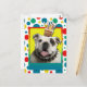 Invite a sus huéspedes con esta fantástica tarjeta de saludo de Bulldog. Con una torta balanceada en la cabeza, el diseño hará sonreír y reír. BTW, Este diseño tiene varias versiones, con diferentes colores de fondo. También hay una versión de Cumpleaños Feliz.