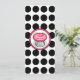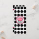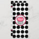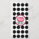 Una invitación con un quequito rosado caliente delineado en negro dentro de un marco rosa y negro a juego. El fondo es blanco con puntos de polka negros. En el lado opuesto se encuentran las características que coinciden con el fondo del punto de polka con el texto en negro y rosa sobre el lado de la funda. Personaliza con detalles de tu evento.