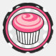 Un pegatina con un ilustracion de un quequito rosado caliente rodeado de un marco a juego. El fondo son puntos de polka blancos sobre negro.