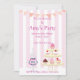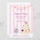 Tortas de Noche y Invitación al cumpleaños de Candy Jar. La invitación perfecta para una fiesta de cumpleaños de Chica. El diseño cuenta con un fondo de rayas de caramelo rosa y blanco, un frasco de cristal lleno de dulces rosas y navales, con una etiqueta tipo bufé de caramelo y cinta de correr. Un bizcocho de tres niveles con una selección de deliciosos pasteles y algunos pasteles de bonito. ¡Cambie la redacción a lo que desee!