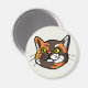 Refrigerador circular redondo simple con imán con dibujo de la cabeza de un gato tortoso con whiskys, jengibre naranja marrón negro y pelo blanco, nariz naranja, negro y blanco dentro de los oídos, y ojos amarillo ámbar dorado.