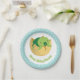 Una pequeña ducha suministra placas de papel con una recién nacida tortuga verde! El pequeño tiene un pequeño pacificador verde en la boca. Círculo blanco y fondo azul con patrón de puntos de polka. Agrega tu mensaje en el espacio proporcionado.