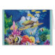 Pintura de seda de una tortuga marina verde y amigos. Pequeños peces de oro, peces ángeles y otros comparten el mar con coloridas algas y corales. Divertido y luminoso para acuarios, tiendas de regalos, regalos y tarjetas.