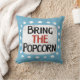 "Bring The Popcorn" es un lindo diseño de texto en azul claro con texto en negro y rojo, junto con una forma de acento blanco y puntos caprichosos de textura blanca que lo rodean.
