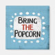 "Bring The Popcorn" es un lindo diseño de texto en azul claro con texto en negro y rojo, junto con una forma de acento blanco y puntos caprichosos de textura blanca que lo rodean.