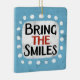 "Bring The Smiles" es un lindo diseño de texto en azul con texto en negro y rojo, junto con una forma de acento blanco y puntos caprichosos de textura blanca que lo rodean.