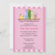 Invitación rosa de Baby Shower con una estantería de libros, una botella de bebé y un pato de goma. Añadir los detalles de su fiesta para una invitación de un tipo.Doodles deliciosos