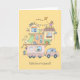 Un pequeño coche remolca un poco más de 3 pisos de remolque de la familia alta que ha sido mejorado de forma irregular. En la azotea hay un pequeño huerto con espantapájaros. En la segunda planta hay una bañera abierta. Una lata de basura en la parte trasera del remolque. Se está secando algo de ropa en el viento. Varios mascotas familiares incluyen un perro, un gato, un pollo e incluso algunos peces de colores. Un niño pequeño ondea desde la ventanilla del remolque.