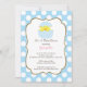 Una invitación dulce de Baby Shower del muchacho del polluelo de Pascua que ofrecía un polluelo lindo del bebé fijó en un fondo azul y blanco de los lunares. Perfeccione para una fiesta de bienvenida al bebé del bebé del tiempo de Pascua. Productos a juego también disponibles en nuestra tienda en www.celebrateitinvites.com. ©Zenware