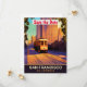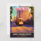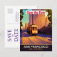 Invitación de boda de San Francisco para guardar la fecha, postal de viaje. Tranvía subiendo las colinas, con edificios detrás.