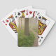 Naipes con una trayectoria que camina con los bluebells que llevan en un bosque en la salida del sol en una mañana de niebla, creando una atmósfera mágica.
