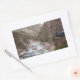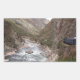 Foto pegatina del tren azul del carril Inca que va desde Cusco hacia Machu Picchu a través del Valle Sagrado o Valle Urubamba con grandes montañas y río Urubamba en Perú.