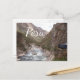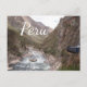 Postal del tren azul del carril Inca que va desde Cusco hacia Machu Picchu a través del Valle Sagrado o Valle Urubamba con grandes montañas y río Urubamba en Perú con el texto: Perú.