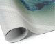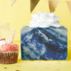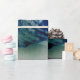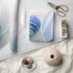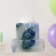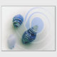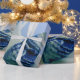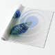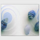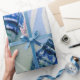 Una interesante vista retrato de tres conchas marinas de fondo azul y blanco con temática de remolinos. Es sólo un recordatorio del océano y sus maravillosos tesoros.