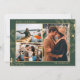 Cartas de vacaciones de diseño botánico de hojas verdes y doradas de cazador con tres de tus fotos favoritas del año. Personalizar con fotos, tu saludo de vacaciones y nombres.