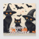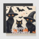 Tres gatos negros con ojos naranjas brillantes se sientan entre calabazas. Dos llevan gorras de brujas mientras los murciélagos sobrevuelan el cielo. Escena divertida pero mística de Halloween que mezcla encanto, magia y un toque de encanto gótico.