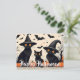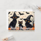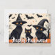 Tres gatos negros con ojos naranjas brillantes se sientan entre calabazas. Dos llevan gorras de brujas mientras los murciélagos sobrevuelan el cielo. Escena divertida pero mística de Halloween que mezcla encanto, magia y un toque de encanto gótico.