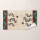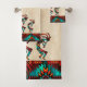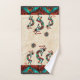 Decore su cuarto de baño con este exclusivo juego de toallas de baño "One of a Kind" del suroeste de Kokopelli. Cuenta con tres Kokopelli del Suroeste jugando a la flauta y bailando bajo el sol en un fondo de piedra arenisca... ¡Rodeado por un borde del suroeste en turquesa, Naranja y negro! Este es un diseño de arte original del artista Kerry Miller.