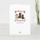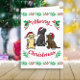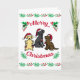 Tarjeta de Navidad de Tres Labradores y Adornos para Propietarios de Labrador Retriever. Muy lindo diseño de dibujos animados de Labrador Retriever con tres Labradores disfrutando de Gorros de Santa y Adornos. Se pintaron Labrador Retriever Amarillo, Labrador Retriever Negro y Labrador Retriever Chocolate. Las expresiones traviesas de Labrador y los colores rojo y verde crean sentimientos festivos.