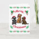Tarjeta de Navidad de Tres Labradores y Adornos para Propietarios de Labrador Retriever. Muy lindo diseño de dibujos animados de Labrador Retriever con tres Labradores disfrutando de Gorros de Santa y Adornos. Se pintaron Labrador Retriever Negro, Labrador Retriever Rojo Zorro y Labrador Retriever Chocolate. Las expresiones traviesas de Labrador y los colores rojo y verde crean ambiente festivo.