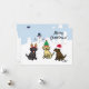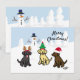 Tarjeta de Navidad de Tres Labradores y Muñeco de Nieve para fanáticos de los Labrador! Arte único y divertido de Labrador Retriever pintado por Naomi Ochiai de Japón. Labrador Negro y Labrador Amarillo y Labrador Chocolate posan con sus divertidos sombreros de Navidad y cuernos en el campo nevado.
