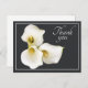 Fotografía impresionante que presenta tres Lirios de Calla blancos contra un fondo colorido, negro o gris. Las flores de lirio cubren la parte delantera de esta tarjeta postal que se puede utilizar como tarjeta de agradecimiento, tarjeta de cumpleaños o cualquier otra tarjeta de su elección. ¡Personalícela con su texto y/o imágenes para hacerla única!