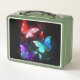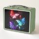 Tres mariposas luminosas, rojas, violetas, verdes, texturadas, nocturnas sobre fondo luminoso negro.