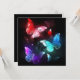 Tres mariposas luminosas, rojas, violetas, verdes, texturadas, nocturnas sobre fondo luminoso negro.