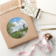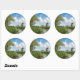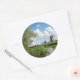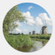 Pegatina fotográfico redondo de tres molinos de viento a lo largo de un canal con botes y cañas bajo un cielo azul con nubes esponjosas creando una escena pacífica en la campiña holandesa de Leidschendam, Holanda.