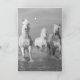Tres caballos blancos de Camarga recorren el pantano en Camargue, Francia, salpicando el agua. Hay otra imagen de tres caballos dentro de la carta. Ambas imágenes son de Carol Walker.