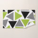 Esta toalla de mano presenta un diseño geométrico abstracto moderno con triángulos de color verde lima, gris y negro dispuestos al azar sobre un fondo blanco.