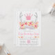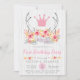 Invitación tribal de primer cumpleaños con cantantes de flores color rosa y oro y pancarta con corona purpurina rosa sobre un fondo rústico de madera blanca. Puede fácilmente personalizar esta hermosa invitación tribal de cumpleaños para su evento añadiendo sus detalles. Este es un diseño impreso sin ningún purpurina real, etc.